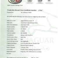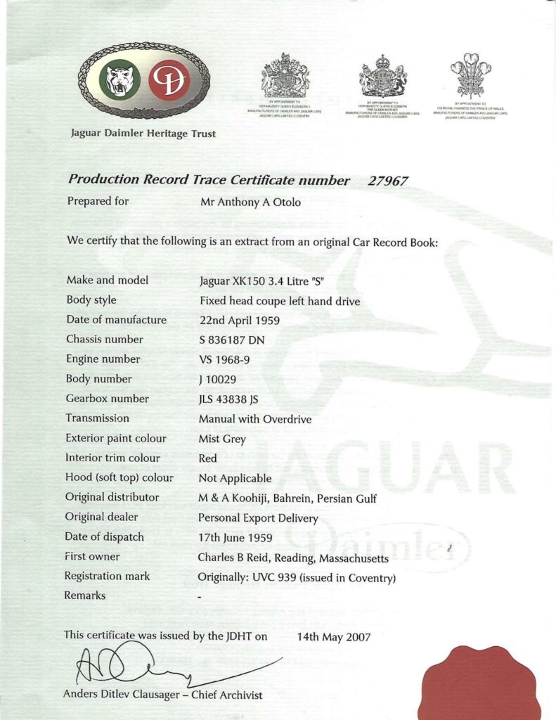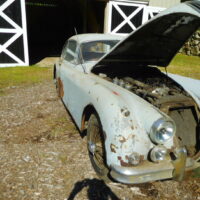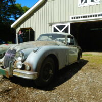 A rare Jaguar – a fully matching number, 1959, 3.4 Liter XK150S fixed head coupe. Only 98 we made and, of these 98 cars, only 67 were sent to the United States. We believe that fewer than 33 have survived making this car quite rare! The car has a beautiful color combination of Mist Grey with a red interior as verified by the Jaguar Heritage Certificate in the photos. We have a full history of the car. The first owner, Mr. Charles B. Reid of Reading, Massachusetts, picked the car up at the factory in Coventry and had English plates with the Registration UVC 939 (Coventry). The car has stayed in the state of Massachusetts since then. Mr. Read later sold the car to Mr. Anthony OTolo of Massachusetts in 2005. We purchased the car from Mr. Otolo, the second owner. The engine will start up and run and we are to believe that the drive train has never been taken out of the car. Obviously, the car will need restoration to bring it back to its original glory, however, having a strong frame makes this car a good candidate for a restoration.