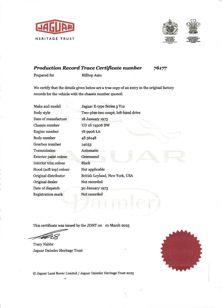 Presenting this 1973 matching numbers Jaguar V-12 E-type which has air conditioning and wire wheels. The car has been in dry storage for awhile and is an ideal candidate for restoration. The car currently rolls and steers so it can be transported, comes with a clean title and a Jaguar Heritage Certificate has been ordered and will be added to the photos when it arrives.